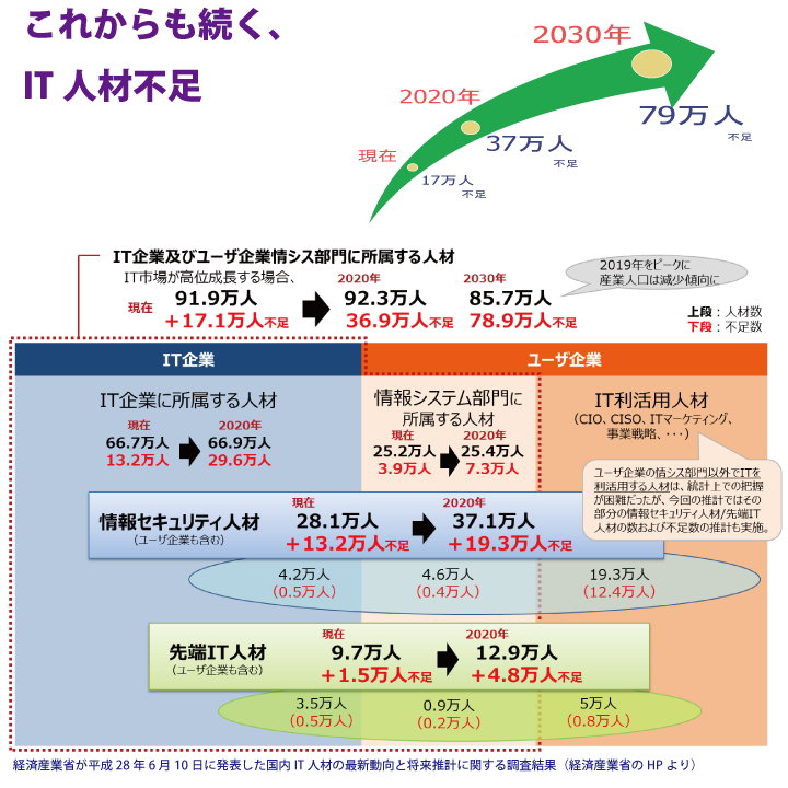 ・先端IT人材は、現在約9.7万人、不足数は約1.5万人ですが、2020年には不足数が4.8万人に拡大。