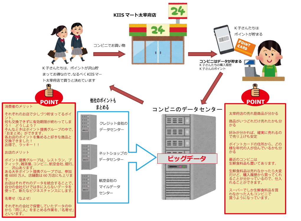 みなさんは、買い物をするときにポイントカードを使っていますか? ポイントカードを提示すれば割引があったり、ポイントを貯めれば大きな買い物もできます。お客さんばかり得しているようですが、お店にもメリットがあります。ポイントカードを作るには、住所、名前、生年月日などを登録しますよね。お店は、どこに住んでいる○○さんが、何時、何を買ったかという情報を集めています。顧客購買履歴情報といいます。この顧客情報を使って売上げ増加やマーケティングなどの戦略に役立てています。
