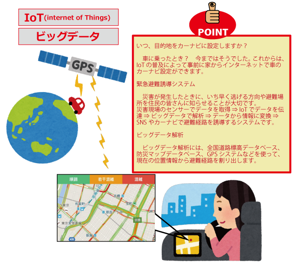 車の位置情報だけでなく、スピード、急ブレーキの回数、何時ごろどの場所でブレーキが踏まれたか等もビッグデータとして集められています。いわゆるIoT(Internet of Things)によって、機械が自動的に通信してデータを送受信しています。このデータを分析することで事故が起こりそうな場所を特定し、道路の改良につなげたり、通行の制限を掛けたりします。集められたビッグデータは、自動運転車の開発にも使われています。