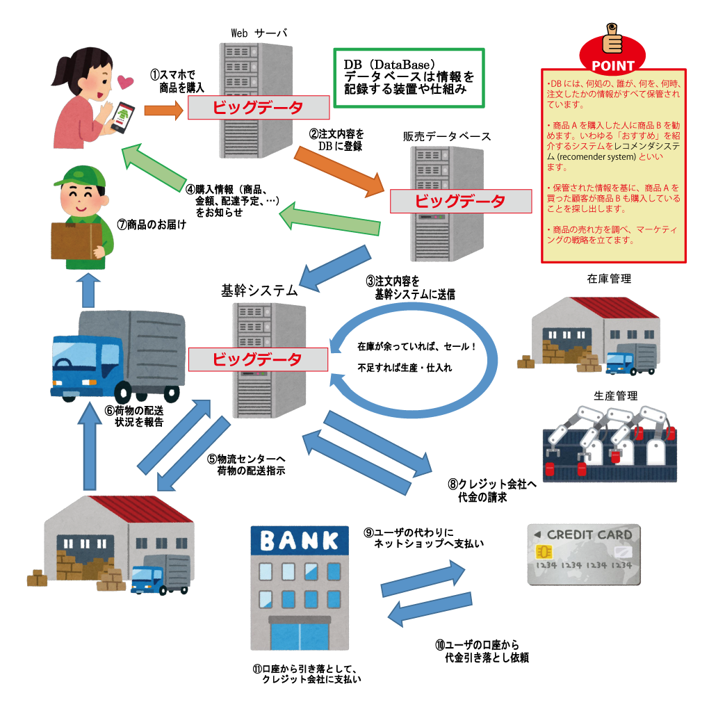 ネットショッピングは、「いつ、誰が、何を、買ったか」の情報が全てデータベース(DB: DataBase) に蓄積されます。ネットショップは、蓄積された大量のデータ(ビッグデータ)を分析し、商品Aを購入した人は、商品Bを購入することが多いというデータや関連商品を探し出し、「おすすめ商品」として紹介し、売上アップにつなげています。購入者にとっても欲しいと思っていた商品を探すことなく、手に入れることができます。利便性は大幅にアップしますね。