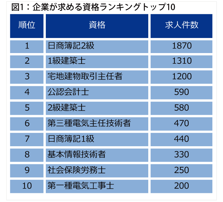 図1は、リクルートエージェントに寄せられた求人の中で、企業が応募者に求める資格のトップ10です。