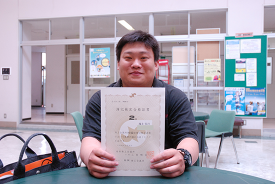 大学に入ってから、簿記3級試験の勉強をしたんですが、一発で合格したので、簿記2級も楽に受かるのではないかと簡単な気持ちでチャレンジしましたが、そんなに甘くはなく、結果は不合格。しかし、この不合格が私の闘志に火を付けました。次は絶対合格してやるぞという強い思いで勉強しました。私は相撲部に入っていて、勉強時間の確保が難しいため、短い時間を有効に活用することを心がけました。ゼミの岩下先生の指導のもと、過去問を中心に、同じような問題を繰り返して解いたことが合格の要因だと思います。また、簿記検定前日に簿記担当の坂根先生から電話がかかってきて、そこでアドバイスしてもらったことが本試験に出るというミラクルが起こり、71点でギリギリ合格することができました。簿記検定2級が70点合格だということを考えると、本当にぎりぎりだったなと思いました。(笑)