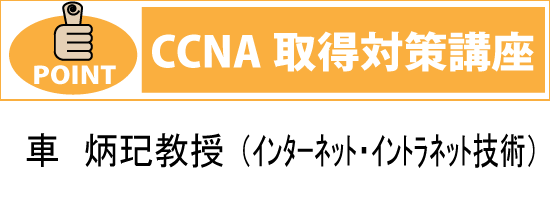 ![]() CCNA対策講座は、2年生前期から3年生の後期まで、4セメスターにわたり行われています。本学ならではの特徴としては、まず、対策講座を通してしっかりと実力を磨き、3年の後期までにCCNA資格を習得し、4年時の就活を有利に持っていくことです。ネットワーク技術をしっかりと身に着けるためには、十分な実習時間を確保するのが大前提であるため、CCNA対策講座は、ふつうの大学授業は週1回90分で行われることに比べ、90分の授業を週3回行っています。 |