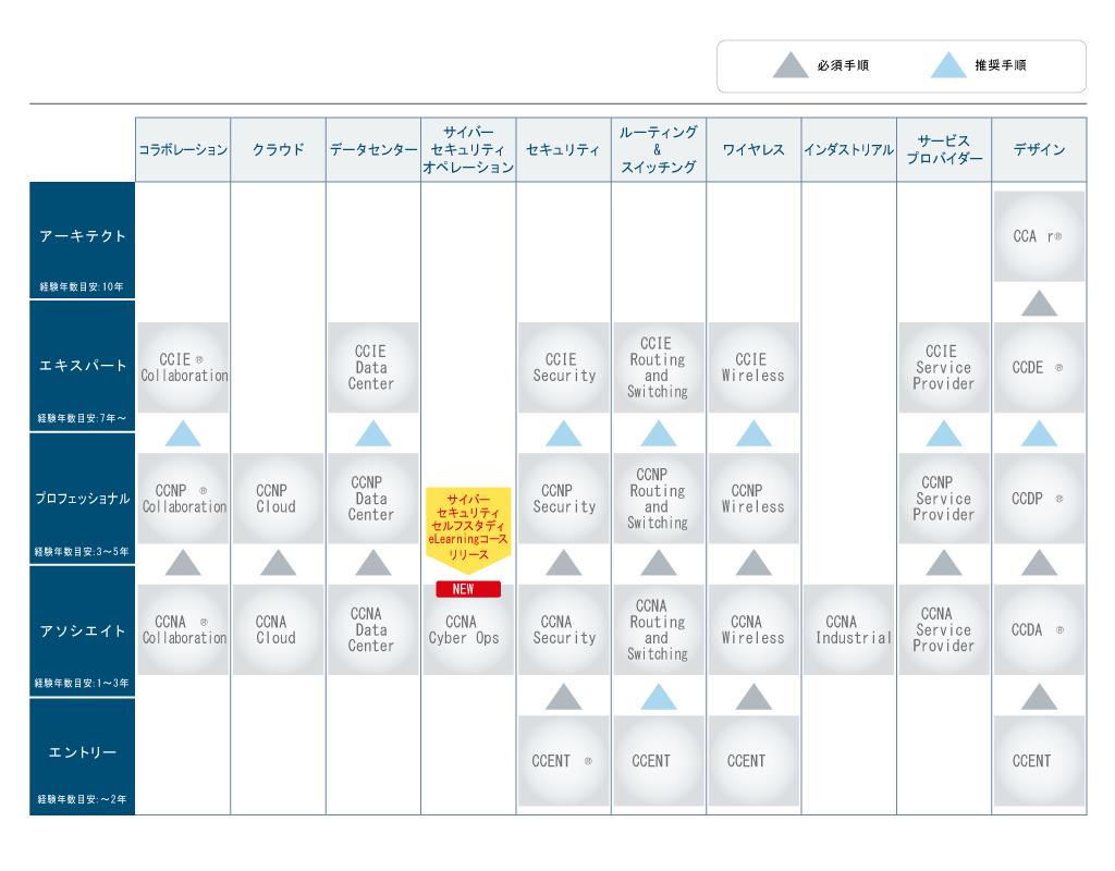 他のシスコ社認定資格とCCNA、CCNPの位置づけです。