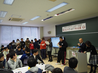 いつもの授業スタイルとはまったく違って、学生たちも大笑い、楽しみながら中小企業や働くことの意味、就職活動への心構えなどを学んでいきます。