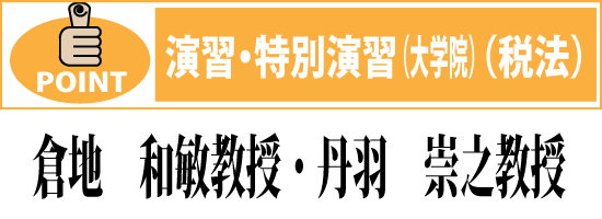 本学の大学院は、昼夜開講制を取り、社会人の方を積極的に受け入れています。そのため夜間はJR博多駅前のサテライトキャンパスにおいて開講しています。 税法に関する科目を修得し、税法に属する科目等に関する修士論文により学位を取得して、その修士論文が国税審議会から認定を受けた場合、税理士試験において、科目の一部が免除されます。税法科目2科目免除の場合 (1)税法に関する開講科目の中から4単位修得 ・租税法特論(2単位) ・税法研究特論(2単位) (2)修士論文の認定を受ける ・税法学関連演習指導担当者 (倉地和敏、丹羽崇之) |