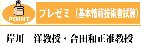 情報系の企業では、ITパスポート取得が必須になっているところも多いようです。本学はカリキュラム面でもこの資格取得に大変有利です。プレゼミでは、より難関な基本情報技術者試験(~ ITエンジニアの登竜門 ~)合格を最終目標として指導しています。(合田准教授から指導を受けている山川君は1年次に基本情報技術者試験に見事合格しました) |