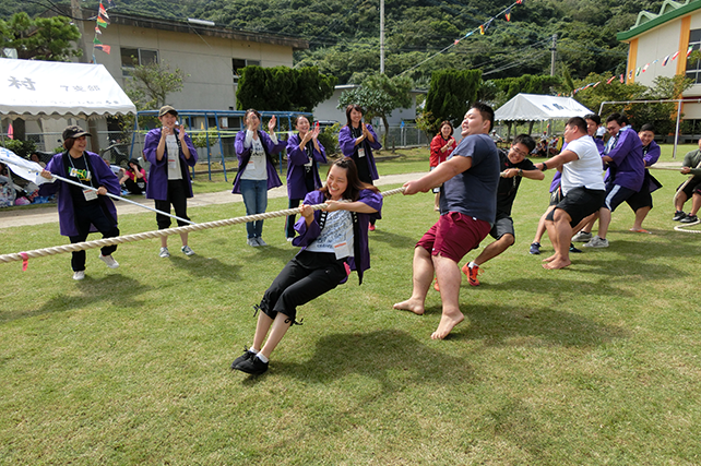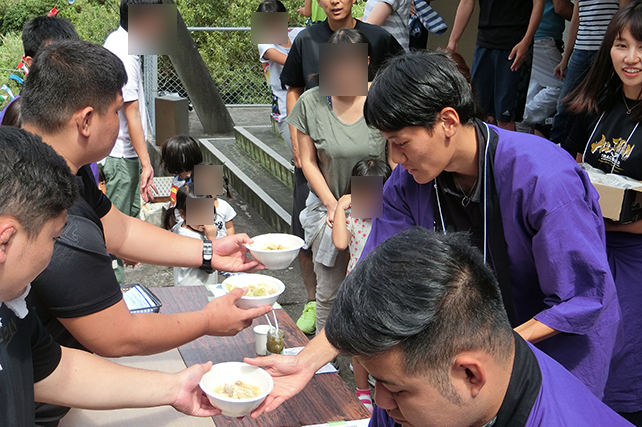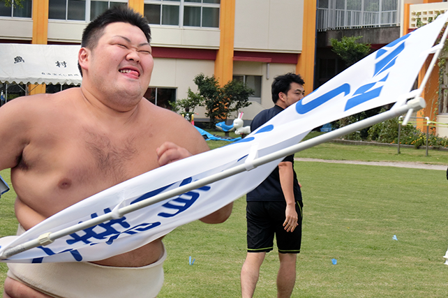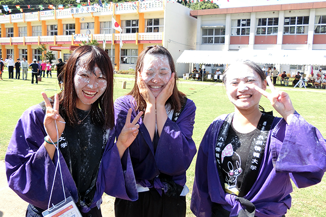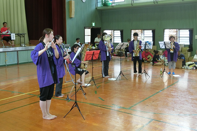 | -瀬々野浦の運動会に参加! 人口150人余りの瀬々野浦。高齢化が進む地区の運動会で若い学生たちが住民のみなさんに混じって、走り、踊り…と競技に参加しました。5年連続で参加すると、学生のことを覚えてくれている島の人たちとの再会の場面も…。甑島とつながっている感に学生たちも笑顔です。今年は昼休み時間を利用して、本学吹奏楽部に所属する学生たちによるミニ演奏会を実施しました。一生懸命に聴いてくださる住民のみなさん姿があり、。喜んでいただけたこと、そして本学の吹奏楽部を知ってただけたこと、感謝感謝です。演奏した学生たちにとっても住民のみなさんが間近で耳を傾けてくださっていることで、演奏にも心がこもっていたように感じました。昼食時間の相撲部特製ちゃんこ鍋提供も含めて、すっかり定着してきている感があり嬉しいかぎりです。 |