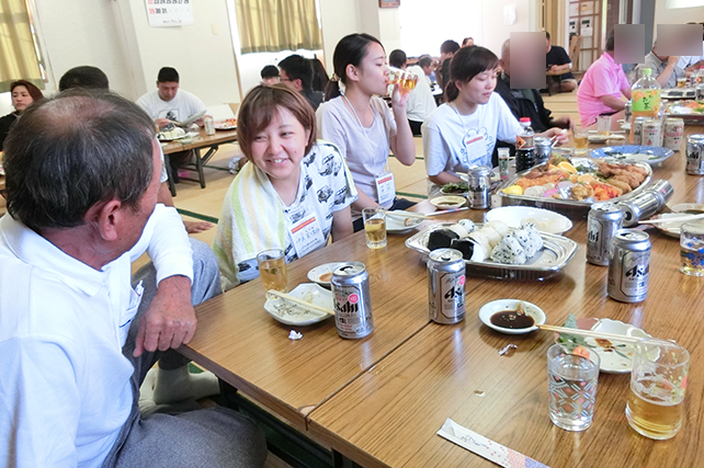 運動会のあと、地域の打ち上げにも参加させていただき、運動会の話、島の話に花が咲きます。宴もたけなわ、カラオケを熱唱する学生と島の人たち。言葉にできないつながりも深まっていきました。