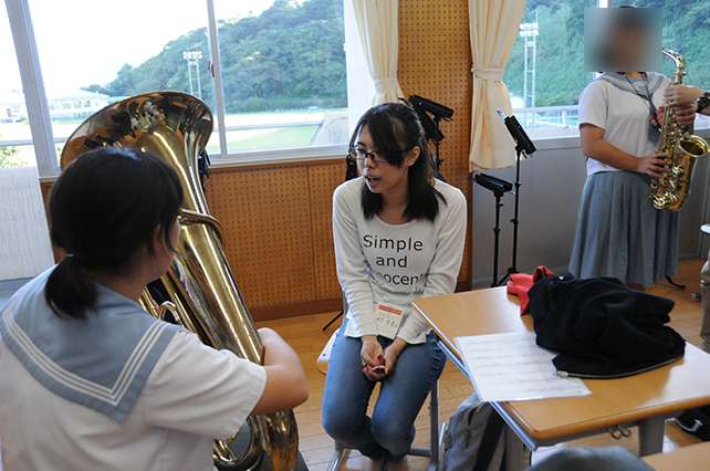 5時限目「音楽」の授業の一環として、海星中学校の生徒全員へ体育館で実施しました。まず、本学の吹奏楽部の参加学生6名による15分程度の演奏会を行ったあと、中学生に吹奏楽や楽器に親しんでもらおうと、それぞれの楽器を簡単な演奏を交えて紹介しました。その後、音楽室・体育館で「なかよし音楽会」に向けた生徒たちの練習を20分ほど本学学生が指導し交流を図りました。放課後は、吹奏楽の楽器に興味をもった生徒たちが音楽室に集まり、楽器を実際に触り吹くという体験を実施しました。一方、中学校でただ一人陸上部に所属している男子生徒へも、本学から参加していた陸上部所属の学生3名が一緒に練習をしながら交流しました。 |