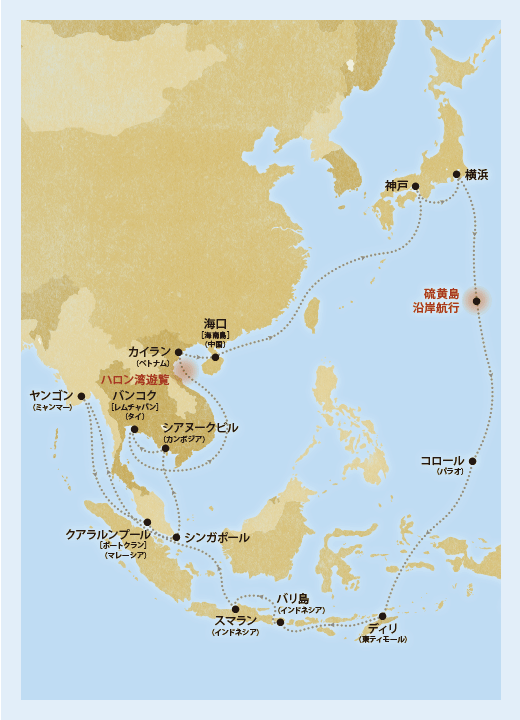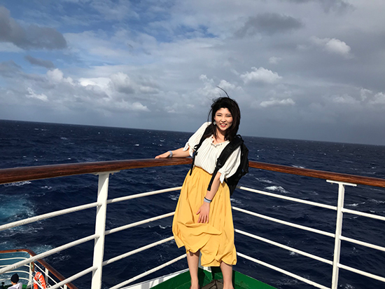 フリンゼミ4年生の高明珠さんは、英語・中国語・日本語の能力を生かし、ピースボート(客船)のボランティア通訳(通称コミュニケーションコーディネーター CC)として採用され、第97回の東南アジアクルーズに乗船しました。 ゼミでの勉強が実を結ぶ 東南アジアの各国へ 2018年の3月に神戸港を出発し、約40日間をかけて14港11か国を訪問しました。寄港した国は、神戸・横浜からパラオ、東ティモール、インドネシア、マレーシア、ミャンマー、シンガポール、タイ、ベトナム、中国で、普段行けないような国で、いろいろな経験をすることができました。 しかし、あくまでもボランティア通訳ということで、通訳業務や船内新聞の翻訳をしなければいけなかったので、本当に忙しかったです。 |