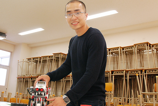 九州情報大学には、様々なゼミがありますが、岸川先生の「ロボットプログラミング」というゼミを選んだ理由は、先生の人柄と、ゼミの雰囲気に尽きます。正直、当時の自分はロボットに関して何の知識もなく、興味さえもなかったです。そんな自分をこのゼミに引き寄せたのは、当時私が選択していた「情報リテラシー演習」という授業でした。この授業を通じて私は岸川先生について知ることができ、また、ゼミというものが一体どのようなものなのかを知ることができました。 先生は普通の授業で日本語がよくわからなかった私でも理解できるよう、丁寧に授業を進めてくれました。また、一般的にゼミといえば、1つの分野に対してより専門的なことを学ぶためのもののようなイメージを持つと思いますが、私が「ロボットプログラミング」を通じて感じたこのゼミの印象は、「雰囲気がいい」や、「楽しい」が大半を占めています。今まで自分は「ゼミは勉強をするところ」という単純な考えしか持っていませんでしたが、このゼミは違うと思いました。もちろん専門的な勉強をして多くの知識を身につけることも出来ますが、それ以上に私は、このゼミの楽しそうな雰囲気に惹かれました。先生を含めゼミ生同士が非常に仲良く、また、先輩と後輩も仲がいいのもこのゼミの特徴だと思います。 ゼミ内にこのような良い雰囲気があるのは、年間を通していくつかあるイベントの影響だと思います。岸川ゼミでは毎年ETロボコンという大会に参加し、年3回の大学のオープンキャンバス、学園祭 など、先生やゼミ生が一体となって取り組むイベントが数多くあります。 岸川先生は「ロボットプログラミング」でゼミの授業内容に加え、以上のようなゼミの楽しさというものを教えてくれました。これはゼミに入るかどうかで悩んでいた私にとって、非常に有意義なことでした。これをきっかけにこの岸川先生のゼミに入った自分はいま、学生生活の中でも大変貴重な時間を過ごせていると実感しています。