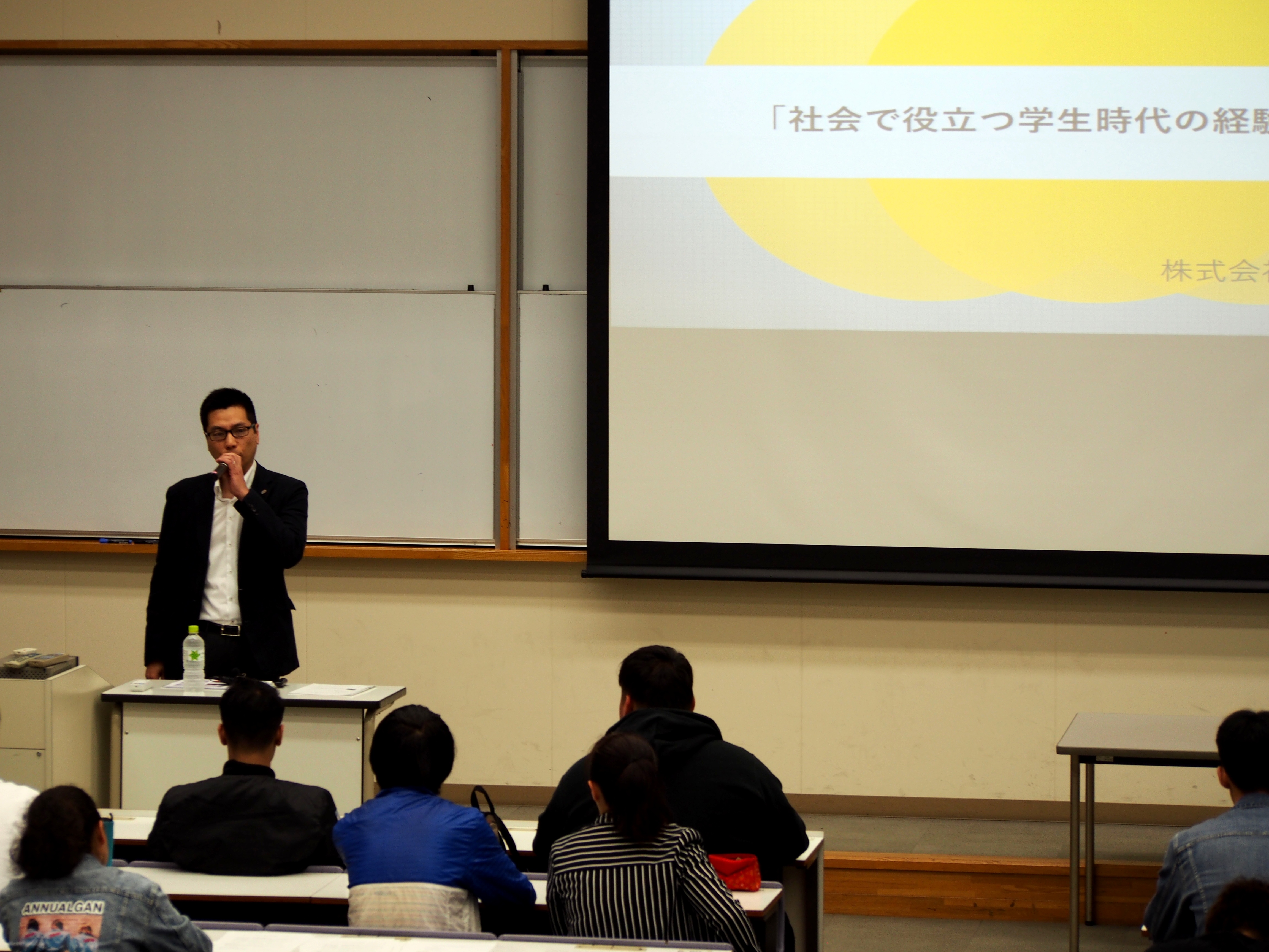 5月18日(土)1年生対象「コミュニケーションと自己発見Ⅰ」において、福岡県中小企業家同友会連携事業として企業人による特別講演を実施しました。