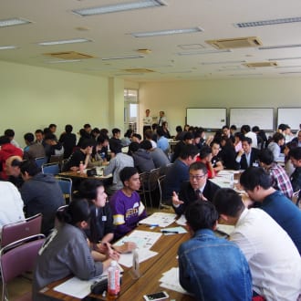 地元福岡の中小企業の経営者の方々、また社会で活躍中の卒業生にお越しいただき、講演やグループ討論などを通して、働くことの意味や大学生生活の過ごし方などについて語っていただきました。終始和やかに和気あいあいとした雰囲気の中、普段接する機会のない経営者の方々や、身近な存在である先輩方の話を直接聞くことができ、学生にとっては、今後の生活において意識を変える良い機会となりました。