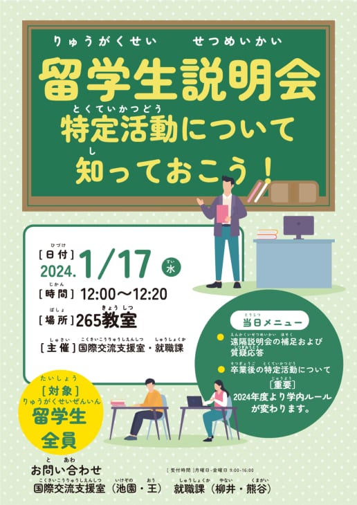※パスワードが分からないなど、説明会へ入れない方は、国際交流支援室にきてください。電話またはメールでの質問も受け付けます。なお本説明会の出席率は、奨学金の選考審査などに影響しますので注意してください。