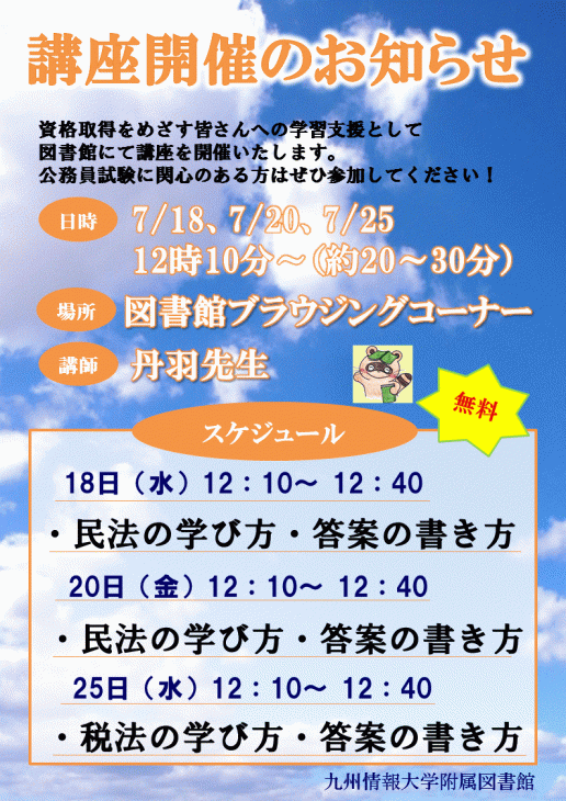 資格取得を目指す皆さんへの学習支援として、昼休みの時間帯に図書館で講座(民法・税法)を開催いたします。