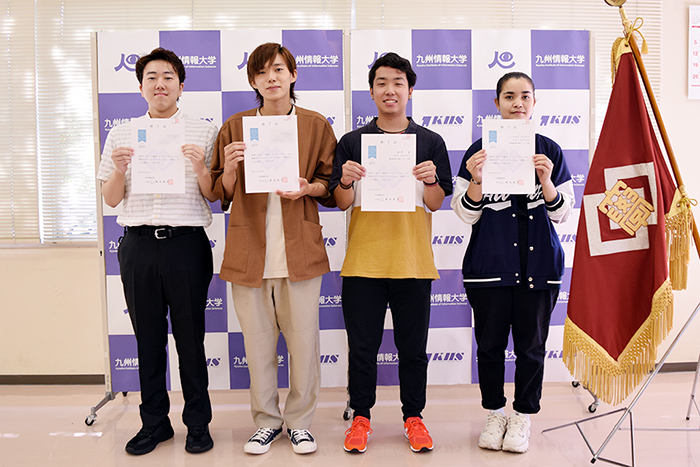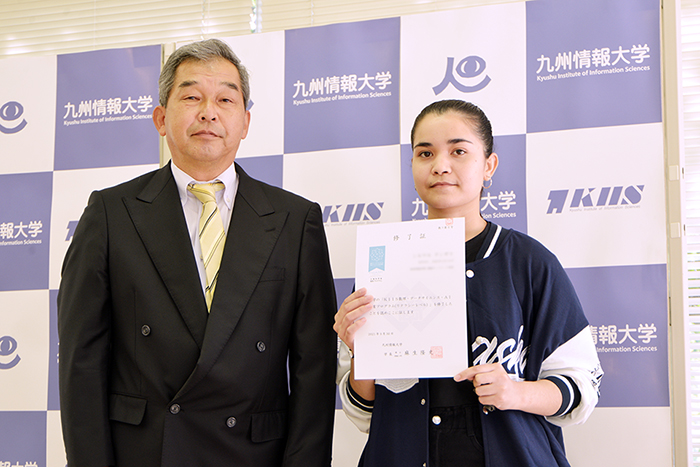 本学は、令和元年度1年次入学生のカリキュラムから、「KIIS数理・データサイエンス・AI教育プログラム(リテラシー・応用基礎)」を実施しています。令和3年度前期終了時点で、7名がリテラシーレベルの修了要件を満たしましたので、本日、修了証を授与しました。本プログラムは、就職活動時にも活用できるように修了要件を満たしたときに修了証を授与しています。